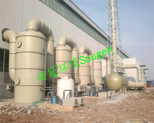 塔體的最上部是除霧段,氣體中所夾帶的吸收液霧滴在這里被清除下來,經(jīng)過處理后的潔凈空氣從廢氣吸收塔上端排出,經(jīng)風(fēng)機(jī)和排放煙囪達(dá)標(biāo)排放。