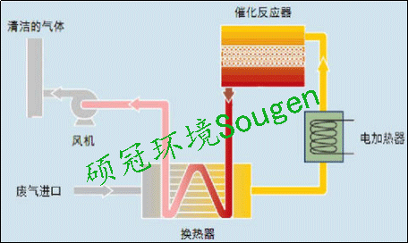 在將廢氣進行催化凈化的過程中,廢氣經管道由風機送入熱交換器,將廢氣加熱到催化燃燒所需要的起始溫度。經過預熱的廢氣,通過催化劑層使之燃燒。由于催化劑的作用,催化燃燒法廢氣燃燒的起始溫度約為250~400攝氏度,大大低于直接燃燒法的燃燒溫度650~800攝氏度,高溫氣體再次進入熱交換器,經換熱冷卻,終以較低的溫度經風機排入大氣。