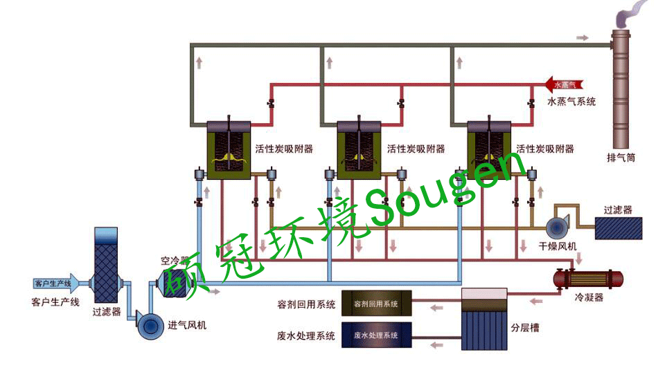 當(dāng)活性炭吸附一段時(shí)間后,啟動(dòng)系統(tǒng)的蒸汽脫附-冷凝回收系統(tǒng),通過熱蒸汽(溫度在100℃左右)將原來已經(jīng)吸附在活性炭纖維表面的有機(jī)溶劑脫附出來,并經(jīng)過冷凝回收系統(tǒng)轉(zhuǎn)化液態(tài)物質(zhì),從而進(jìn)行回收利用。