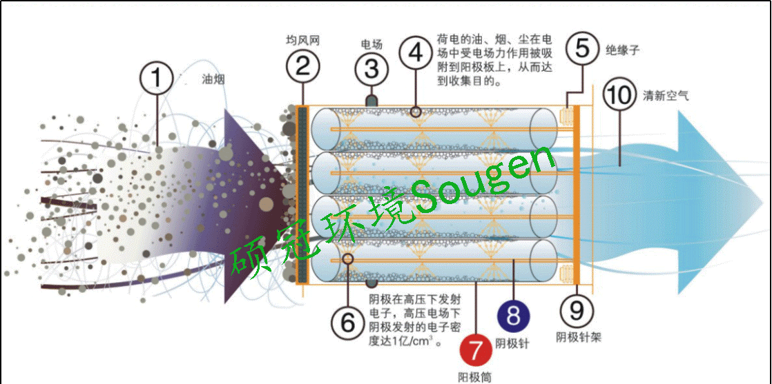靜電油煙凈化是利用陰極在高壓電場(chǎng)中發(fā)射出來(lái)的電子,以及由電子碰撞空氣分子而產(chǎn)生的負(fù)離子來(lái)捕捉油煙、油霧粒子,使粒子帶電,再利用電場(chǎng)的作用,使帶電粒子被陽(yáng)極所吸附,以達(dá)到清除目的。由于電子的直徑非常小,其粒徑比油煙及油霧粒子的粒徑要小多個(gè)數(shù)量級(jí),而電場(chǎng)中電子的密度很高,處在電場(chǎng)中的煙塵粒子很容易被電子捕捉(即荷電),帶電粒子在電場(chǎng)中受到電場(chǎng)力(庫(kù)化力)的作用被吸附到陽(yáng)極上。