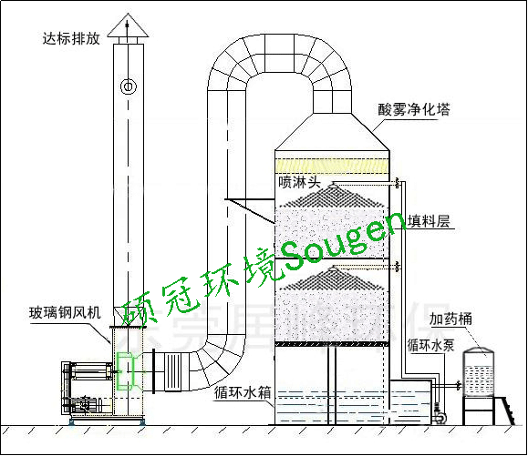 酸霧廢氣由風(fēng)管引入凈化塔,經(jīng)過(guò)填料層,廢氣與氫氧化鈉吸收液進(jìn)行氣液兩相充分接觸吸收中和反應(yīng),酸霧廢氣經(jīng)過(guò)凈化后,在經(jīng)除霧板脫水除霧后由風(fēng)機(jī)排入大氣。