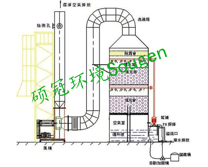 利用強堿(氫氧化鈉)或強氧化劑(雙氧水)作為洗滌噴淋溶液與氣體中的氯氣分子發(fā)生氣-液接觸,使氣相中之臭味成分轉(zhuǎn)移至液相,并藉化學藥劑與臭味成分之中和、氧化或其它化學反應去除臭味物質(zhì)。