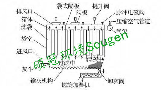 主體分隔成很多個(gè)過(guò)濾箱體,每個(gè)箱體內(nèi)裝多條濾袋,并在每個(gè)箱體側(cè)邊出口管道上設(shè)一個(gè)氣缸帶動(dòng)提升閥。含塵氣體由其中一個(gè)進(jìn)風(fēng)口進(jìn)入灰斗,由于氣體體積的急速膨脹,一部分較粗的塵粒受慣性或自然沉降等原因落入灰斗,其余大部分塵粒隨氣流上升進(jìn)入袋室,經(jīng)濾袋過(guò)濾后,塵粒被滯留在濾袋的外側(cè),凈化后的氣體由濾袋內(nèi)部進(jìn)入上箱體,經(jīng)過(guò)排風(fēng)口排入大氣,從而達(dá)到除塵的目的。