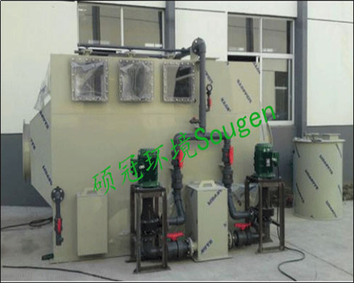 有害的廢氣從塔體的一側(cè)進(jìn)入,洗滌塔內(nèi)部設(shè)有一定高度的填料層廢氣橫穿過(guò)填料層,從塔另一側(cè)排出。從塔體的上部設(shè)有噴淋系統(tǒng),利用清水作循環(huán)吸收液,循環(huán)水從塔體的上部的布水器噴淋至填料層,潮濕填料外表構(gòu)成流動(dòng)的液膜。填料層內(nèi)氣、液兩相呈逆向流動(dòng),氣液兩項(xiàng)在塔內(nèi)逆流接觸,利用有害廢氣在吸收劑中的必定的溶解度,可溶的部分不斷融入吸收液中,到達(dá)降低氣體中有害組分含量的目的。根據(jù)廢氣成份加入適當(dāng)量的藥劑,有害廢氣不斷被吸收或是被化學(xué)反應(yīng)去除掉,因此在水平氣流中的濃度愈來(lái)愈低,塔體的最后端設(shè)有除霧段,氣體中所夾帶的吸收液霧滴在這里被清除下來(lái),經(jīng)過(guò)處理后的潔凈空氣從廢氣吸收塔尾部排出,經(jīng)風(fēng)機(jī)和排放煙囪達(dá)標(biāo)排放。