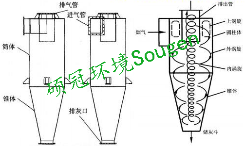 旋風(fēng)除塵器是利用離心力來除塵的,當(dāng)含塵氣流由進氣管進入旋風(fēng)除塵器時,氣流將由直線運動變?yōu)樾D(zhuǎn)運動,借助于離心力降塵粒從氣流中分離并捕集于器壁,再借助重力作用使塵粒落入灰斗。