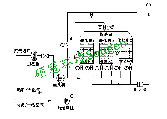 蓄熱式催化燃燒治理技術(shù)是典型的氣-固相反應(yīng),其實(shí)質(zhì)是活性氧參與的深度氧化作用。在催化氧化過程中,催化劑表面的吸附作用使反應(yīng)物分子富集于催化劑表面,催化劑降低活化能的作用加快了氧化反應(yīng)的進(jìn)行,提高氧化反應(yīng)的速率,工作溫度在250~400℃。在特定催化劑的作用下,有機(jī)廢氣(VOCs)在較低的起燃溫度下發(fā)生無焰氧化燃燒,氧化分解為二氧化碳和水,并放出大量熱能,產(chǎn)生的熱量儲存在蓄熱陶瓷體內(nèi)。將儲存的熱量和廢氣源冷氣流進(jìn)行冷熱交換,置換熱能,提高廢氣源的溫度,當(dāng)換熱后達(dá)到工藝溫度時(shí)可關(guān)閉電加熱系統(tǒng),大大降低的能耗。廢氣濃度達(dá)到一定值時(shí),氧化反應(yīng)后產(chǎn)生的熱量又儲存在畜熱體內(nèi),可以保證設(shè)備在無運(yùn)行功率的狀態(tài)下正常運(yùn)轉(zhuǎn)。